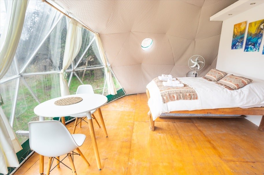 El complejo cuenta con 3 domos y dos cabañas ofreciendo una forma única de disfrutar la naturaleza. Están construido de manera amigable con el ambiente y el entorno que lo rodea. Su forma geodésica propicia que los huéspedes conecten con la armonía del lugar. Sus ventanales geométricos irregulares muestran vistas increíbles propiciando el relax y descanso.